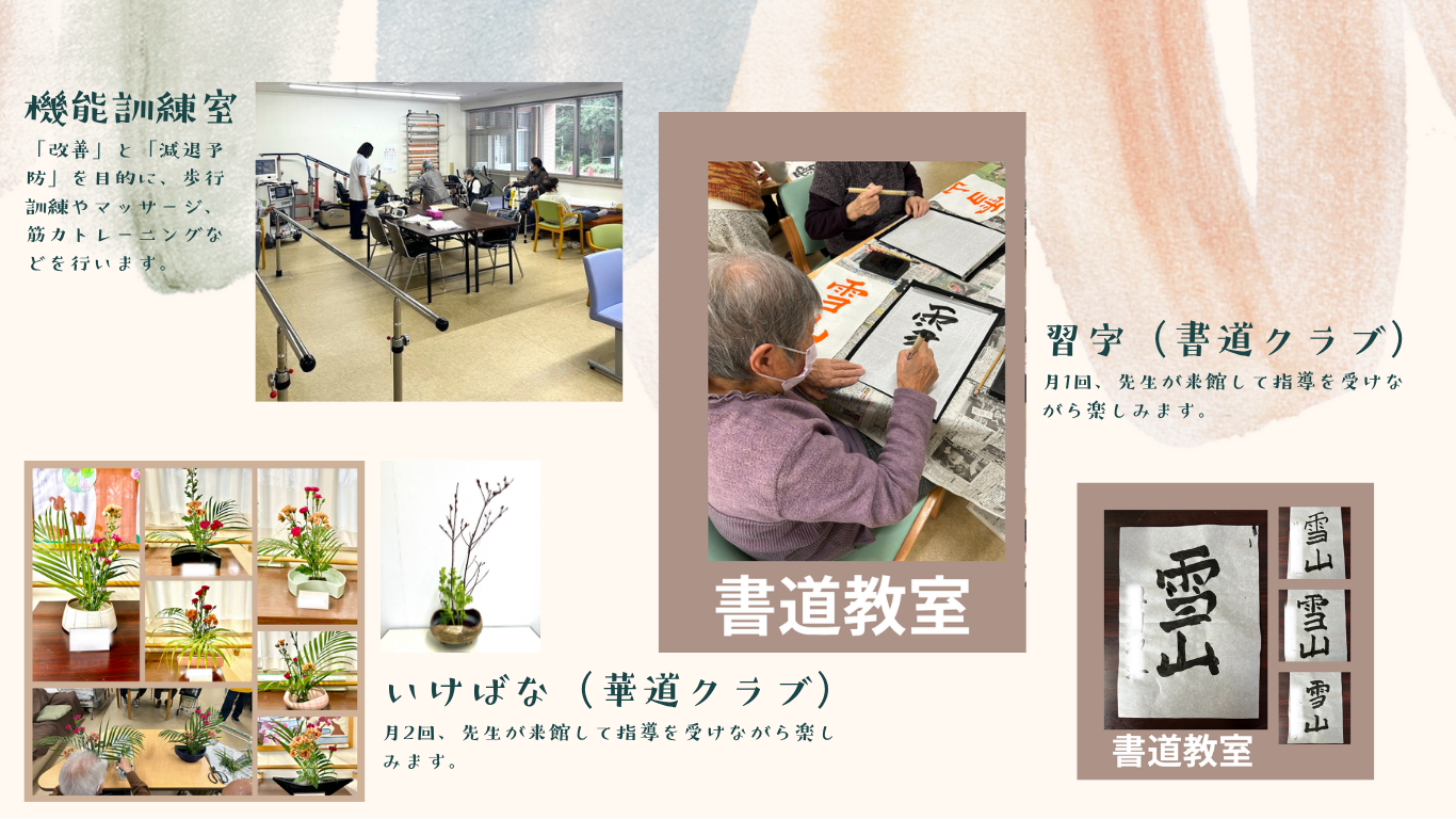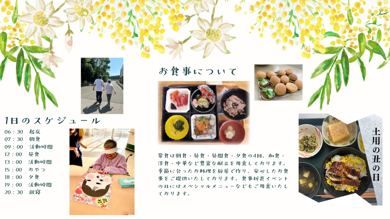 食事、入浴、睡眠、そして日中は趣味など各種文化的な活動を通じて、充実した日々を送っていただけます。